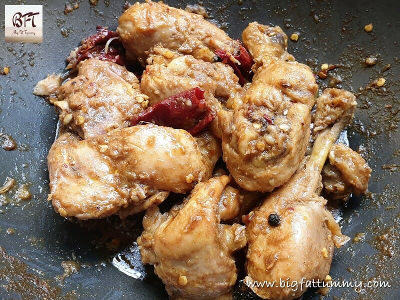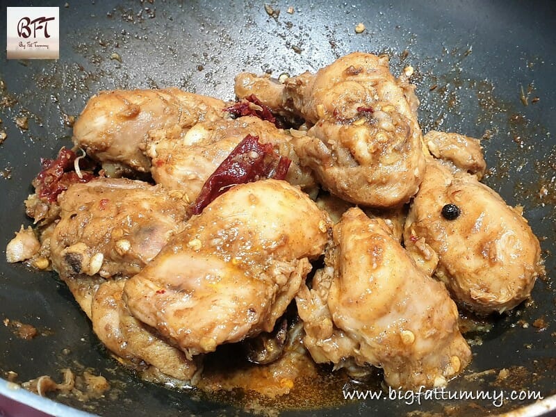 Step 3:Β Β Β Β  Later, transfer the chicken to a pan or kadai and cook covered on low heat for 20 to 25 minutes (do not add any water when cooking). After 20 to 25 minutes, open the lid and continue cooking to let the liquids, if any, dry out.