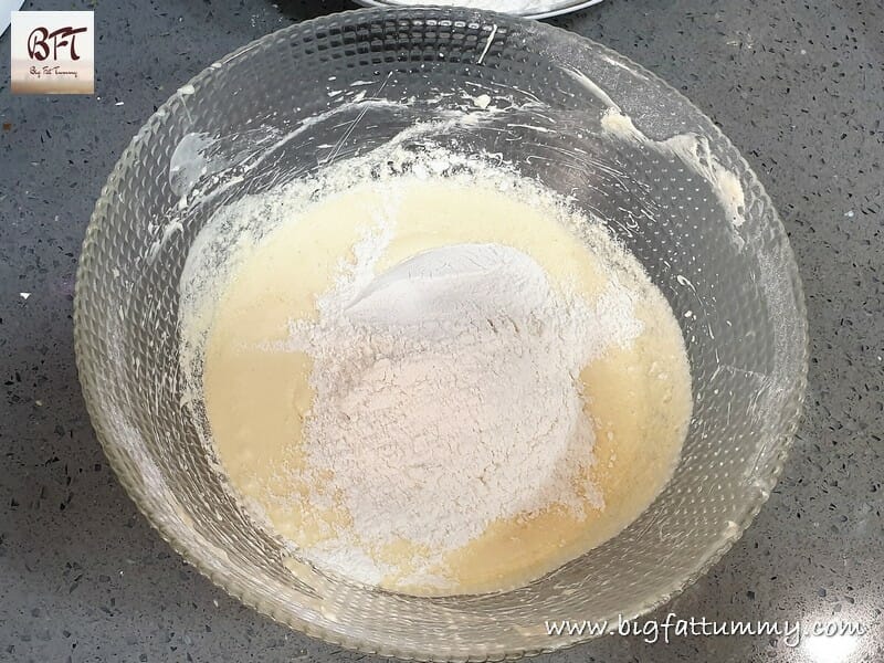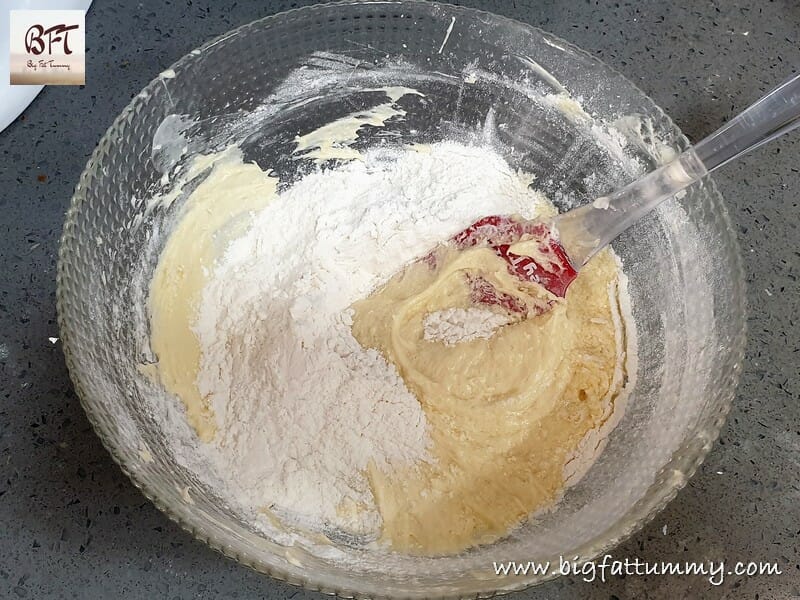 Step 5: Mix / Fold in the sieved flour in two parts using a spatula.