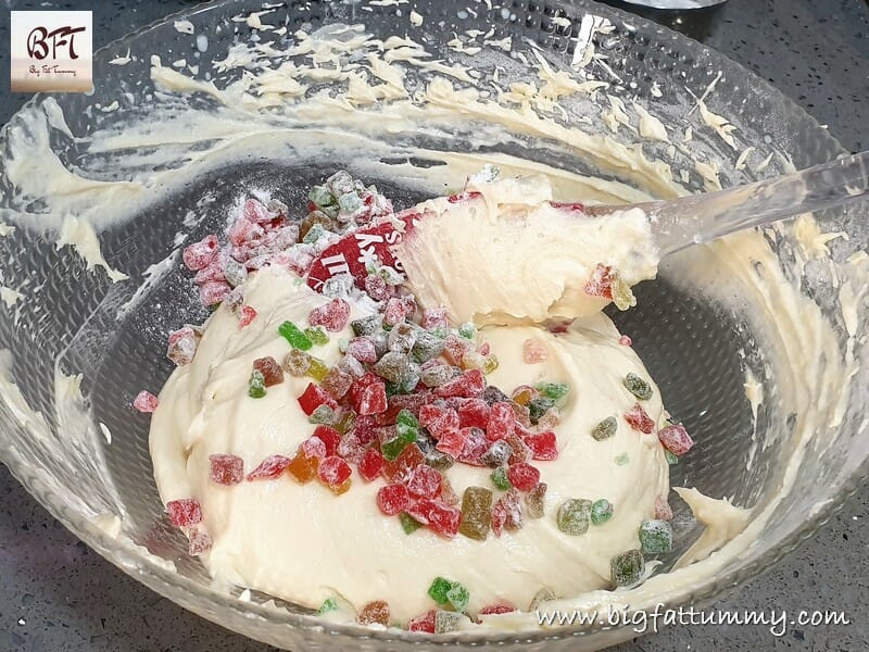 Step 7: Fold / Add the flour coated tooti frooti into the batter / dough and mix.