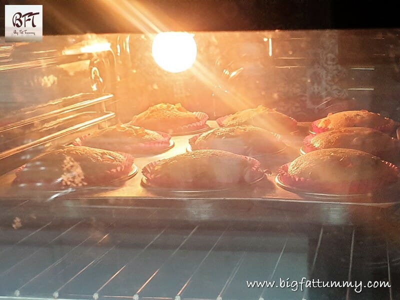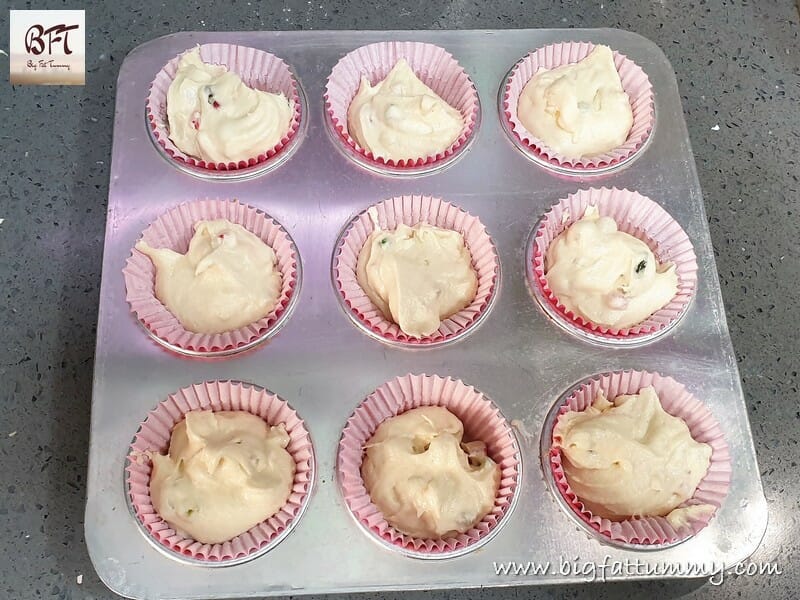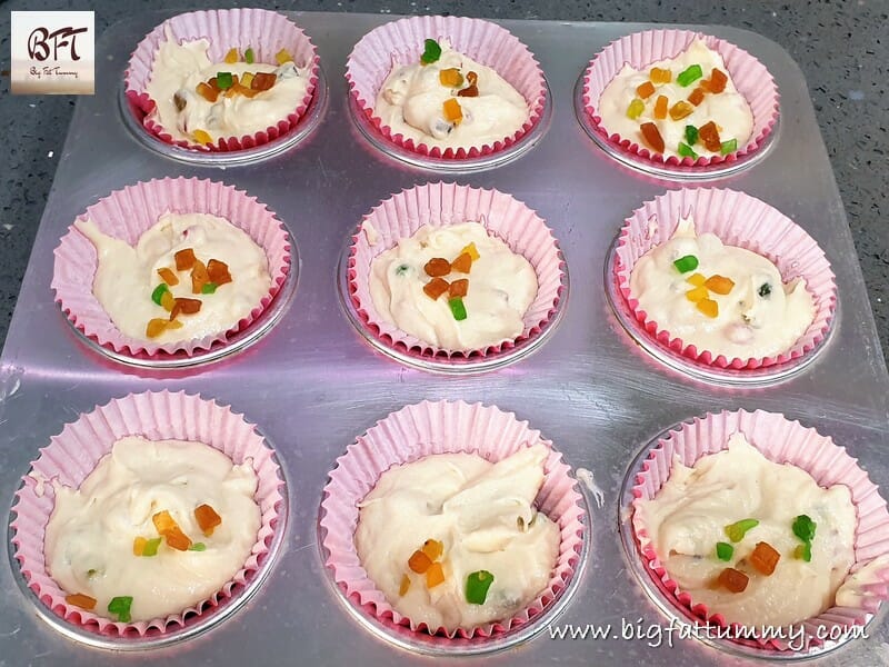 Step 8: Line your muffin tray with paper muffin liners and scoop 2 tbsp. of the batter into the paper liners. Tap the tray 2 times to settle the batter. Place 2 to 3 pieces of tooti frooti on the top of each muffin.