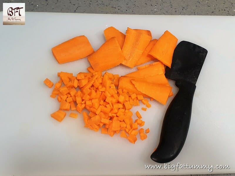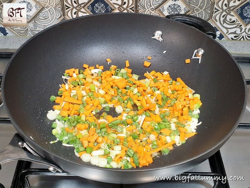 Step 3: In the same wok add 3 tbsp. of oil and add the garlic and sauté for 30 seconds on high heat. Then add the spring onion whites, carrot and french beans. Sprinkle the salt and sauté on high heat till they are cooked but still crunchy (3 to 4 minutes).