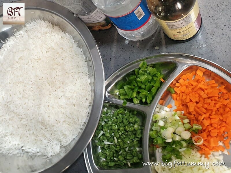 Step 1: Cook the rice and cool (you can also refrigerate once cooled). Prepare all the vegetables and keep every ingredient measured and at hand.