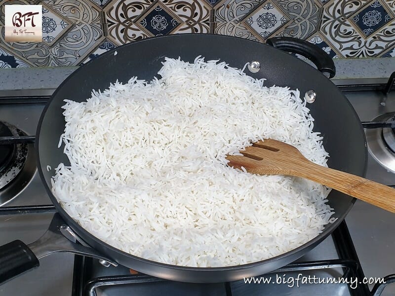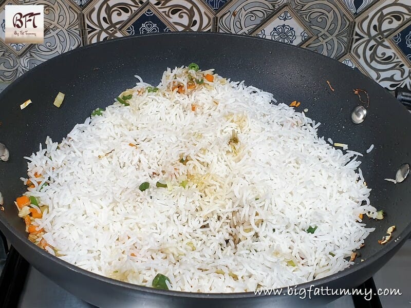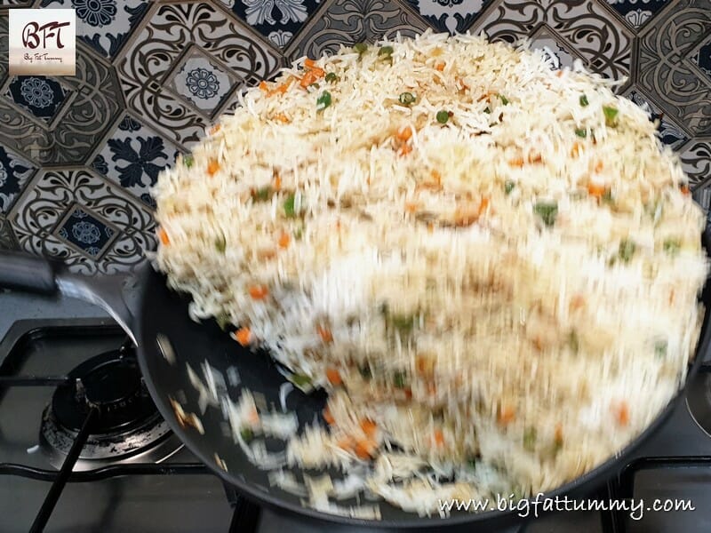 Step 6: Now add the rice and toss or mix gently with a spatula till all the grains are nicely coated.