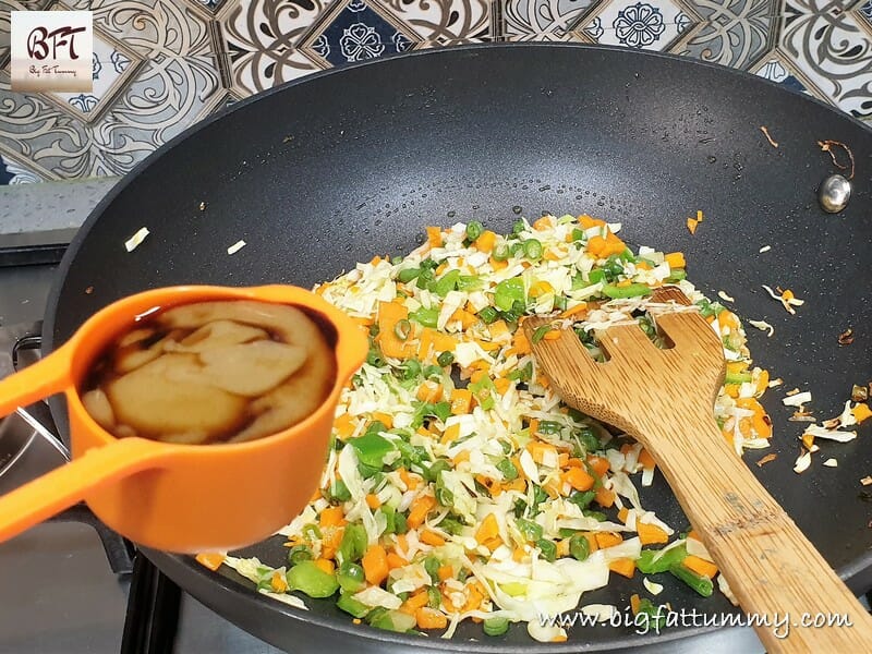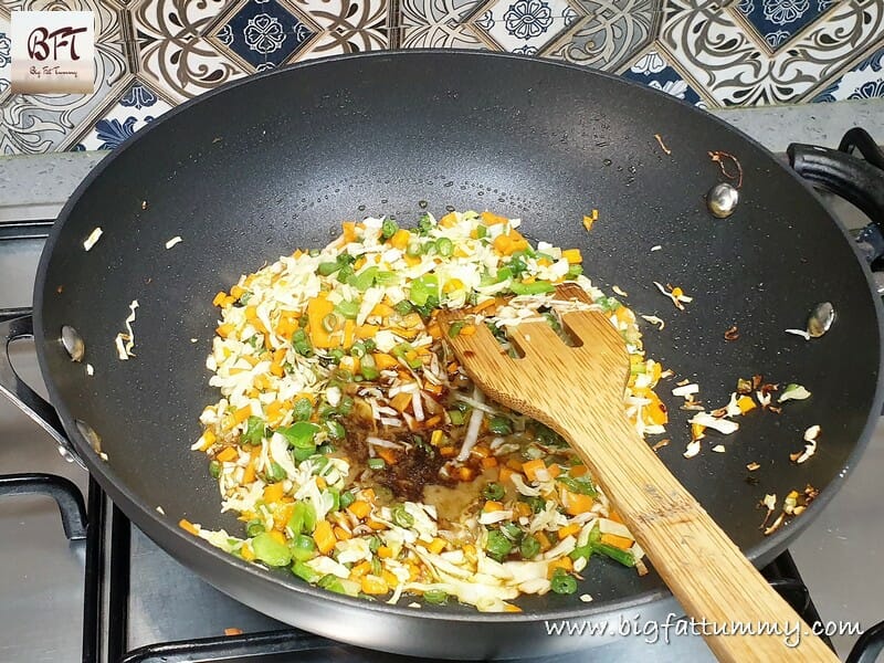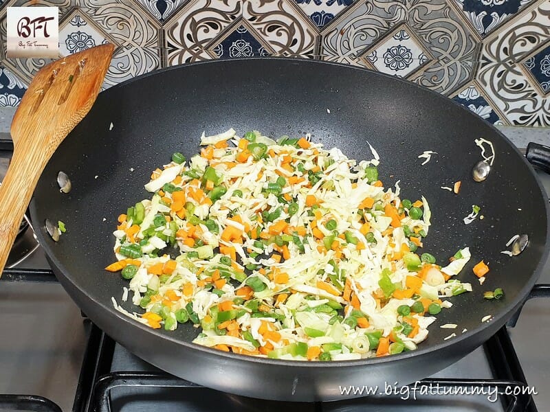 Step 4: Next add the capsicum, cabbage and spring onion greens and continue to cook on high heat for another 2 minutes.
