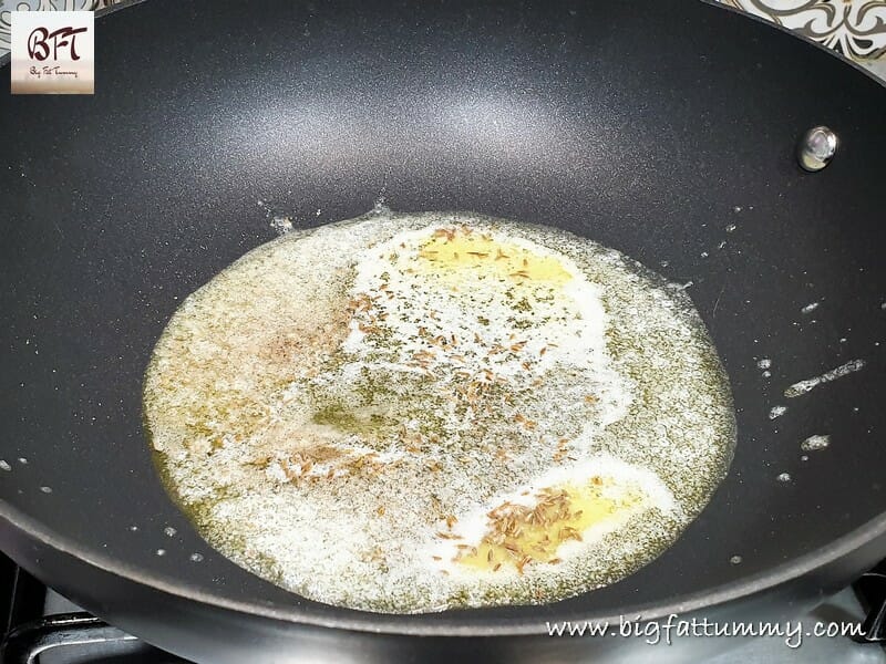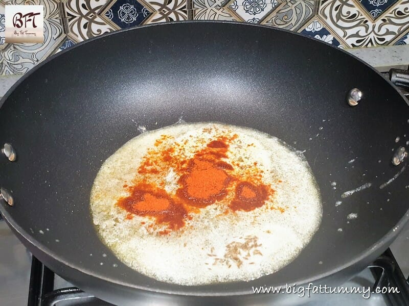 Step 2: Heat the oil and 50 gms of the butter on low heat (Low heat only or it will burn out soon). Add the powdered cardamom seeds and cumin seeds and saute for 30 seconds. Then add the chilly and turmeric powder and cook for a few more seconds.