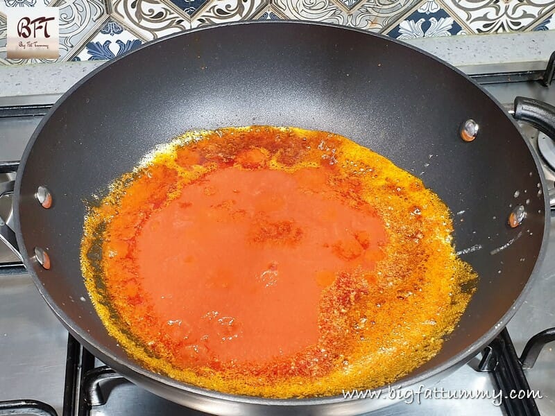 Step 3: Add the tomato puree and continue cooking on medium heat whilst stirring in between till the raw smell disappears.