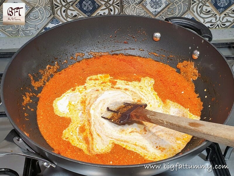 Step 4: Now add the whisked curds and mix and cook for 2 minutes on low heat.