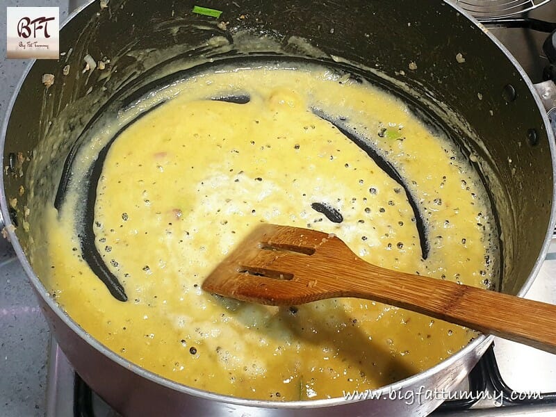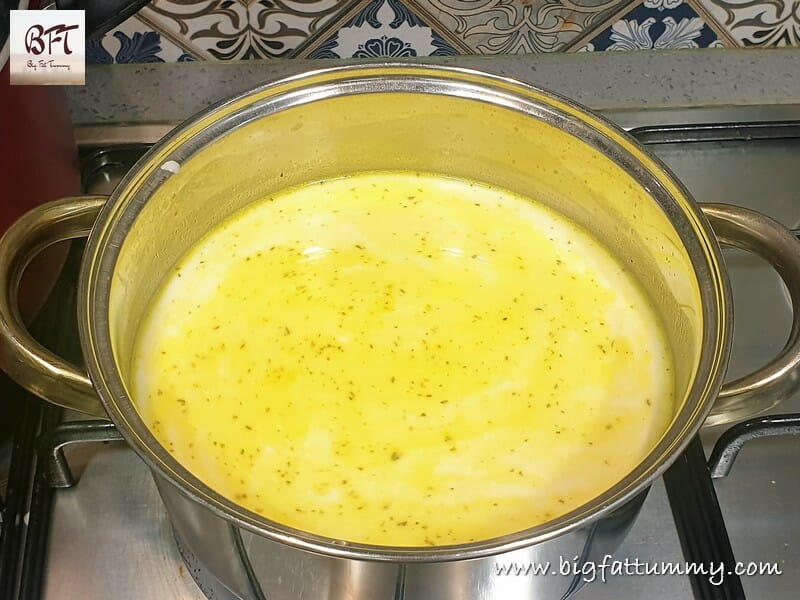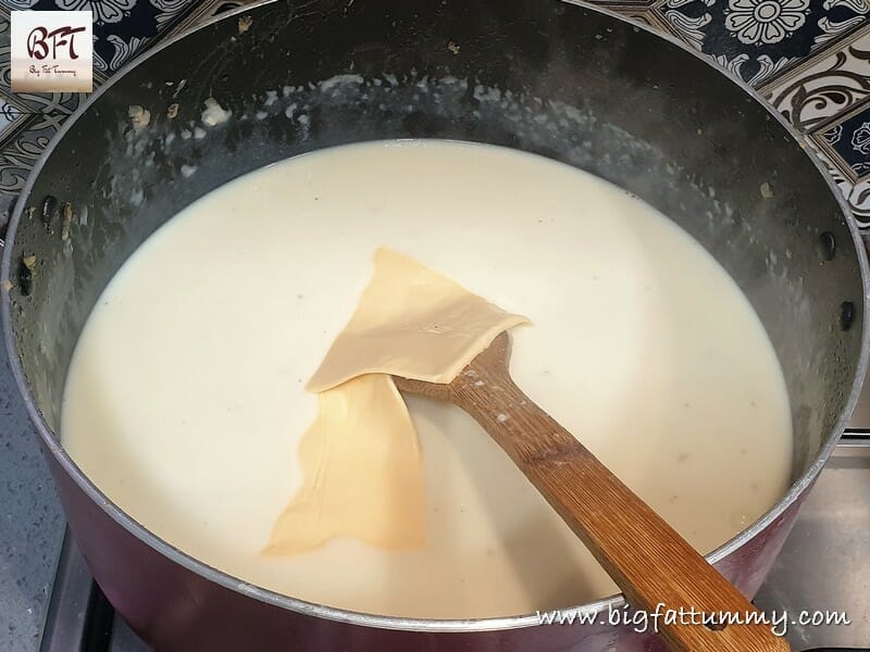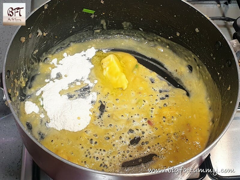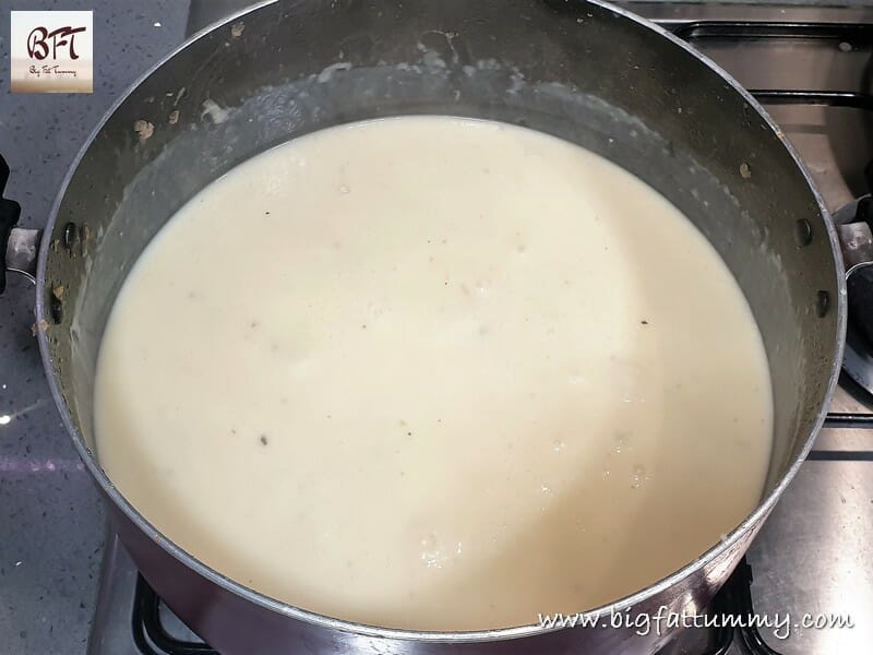 Step 6: In the same pan, melt the butter and add the madia and cook on medium heat for 2 minutes whilst stirring continuously till a roux (sauce thickening mixture) is formed. Mix the stock and the milk and add to the pan. Cook stirring continuously till the sauce thickens.