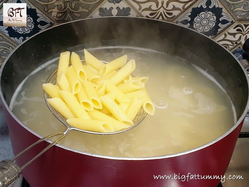 Step 2: Cook and drain the pasta as per the instructions on the pack till al dente (firm to the bite). Once cooked, drain and then pour cold water / tap water over it. Drain and keep aside.