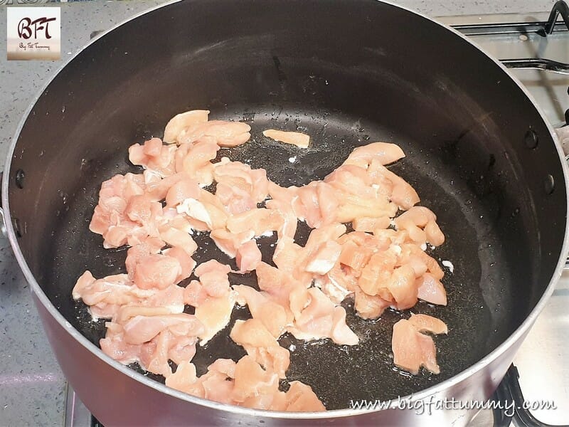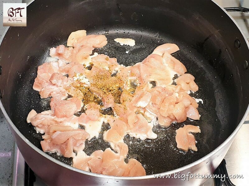 Step 3: Heat 1 tbsp. of oil in a pan and add the chicken bits. Season with ½ tsp. salt, ½ tsp. pepper and ½ tsp. pasta seasoning. Cook on medium heat for 2 to 3 minutes till the chicken is cooked. Then remove from the pan and transfer to a bowl.