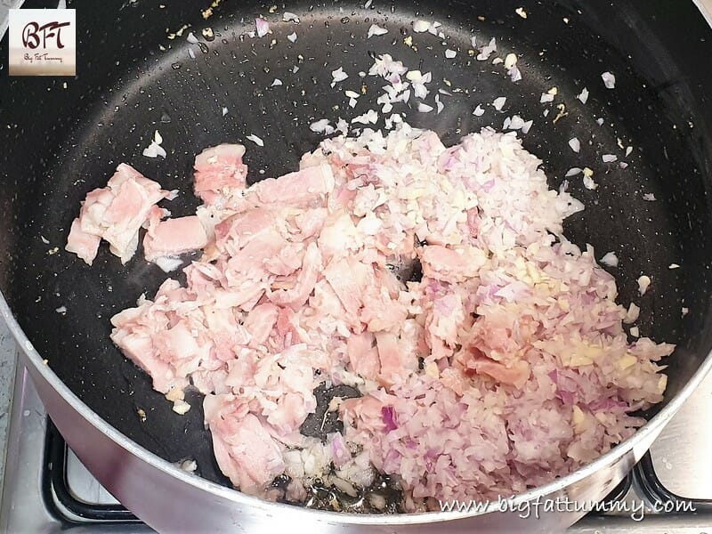 Step 4: In the same pan, heat another 2 tbsp. of oil and add the bacon, garlic and onion and sauté for 6 to 8 minutes on medium heat till the onion is soft.