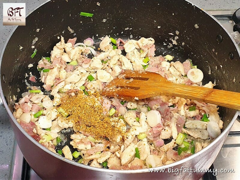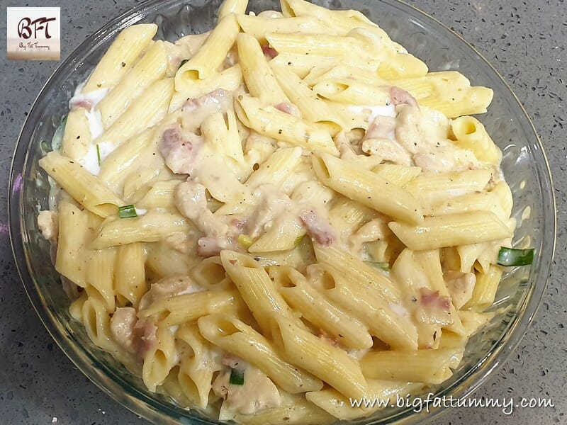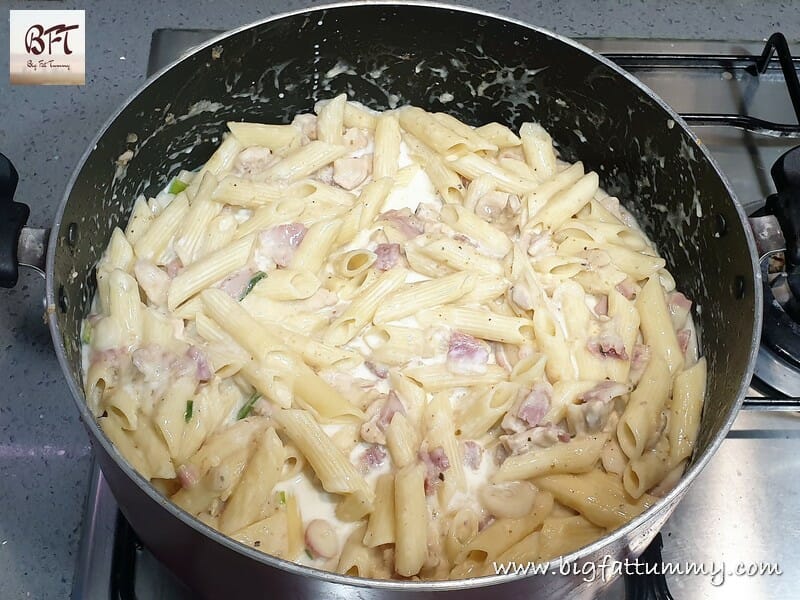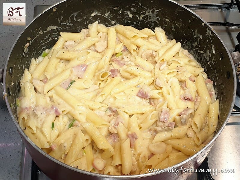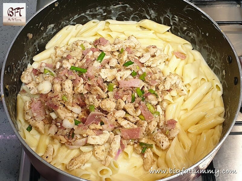 Step 8: Then add the pasta, and the fried onion-chicken-bacon and mix well. Switch off the heat. (If the pasta mixture seems too dry add the optional ½ cup of milk).