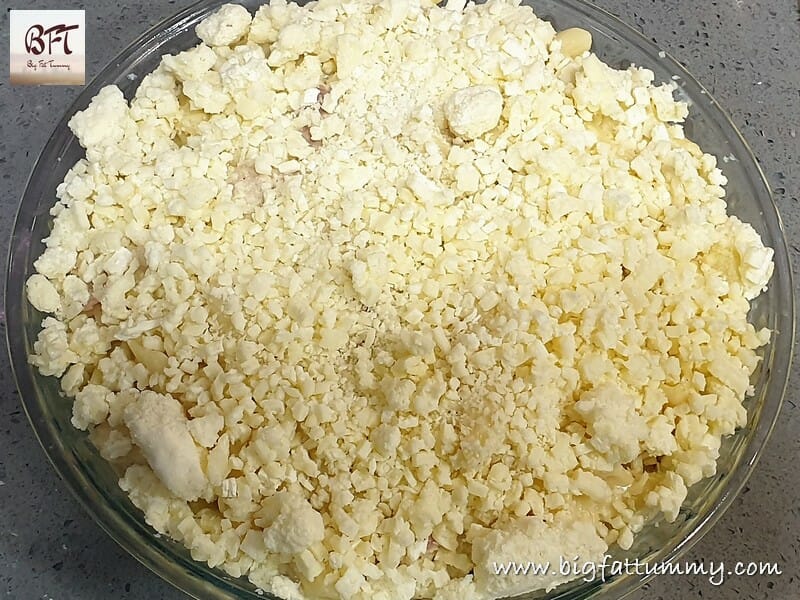 Step 9: Transfer the mixture to a big oven proof baking dish (10 inch) or two smaller ones. Sprinkle the grated Mozzarella all over.