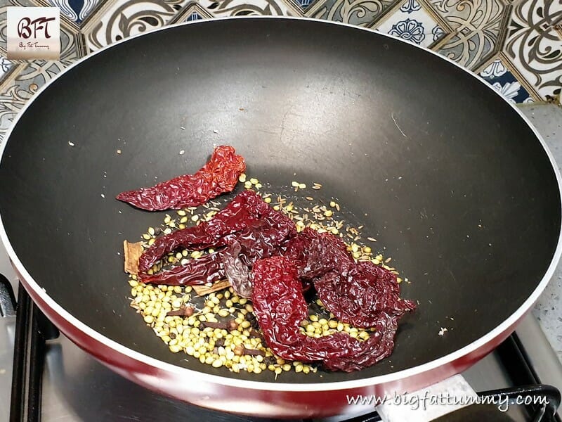 Step 4: Next roast the coriander, cumin, pepper corns, cloves, cinnamon and red chillies on low heat and transfer to the plate with the coconut (The roasting at Step 3 & 4 is to be done just slightly).