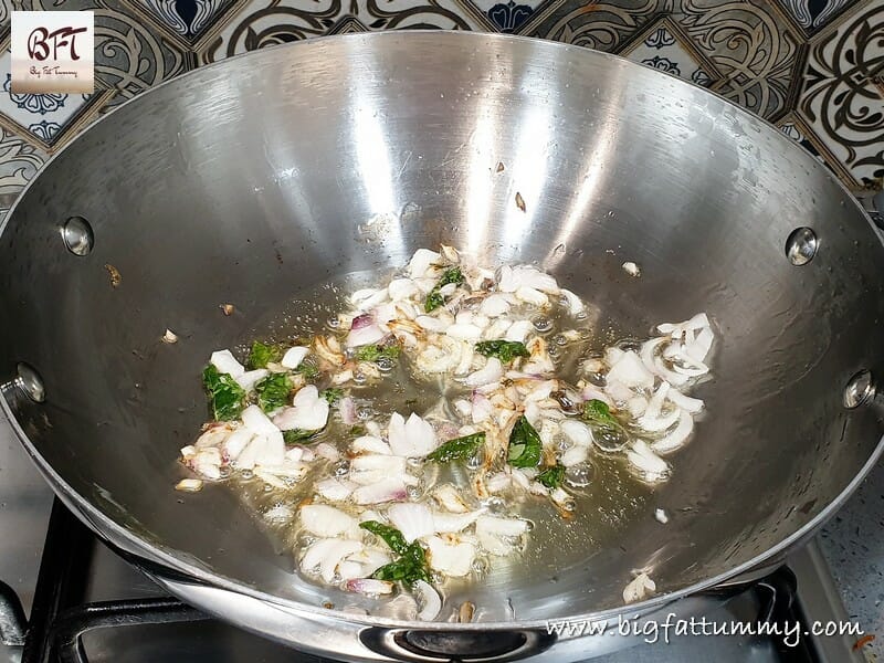 Step 6: Heat oil in a vessel and add the curry leaves and the chopped onion. Sauté till light golden on medium heat.