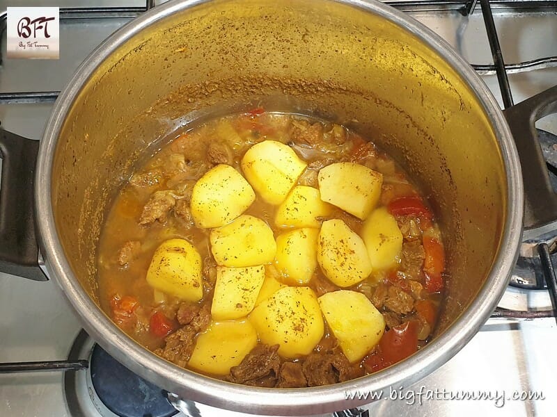 Step 8: Add the cooked meat and potatoes along with the stock. Add hot water to adjust the curry consistency as per your choice. Add the stock cube and mix. Then check for salt and add if required. Cook covered for 10 to 12 minutes till oil floats on the surface.