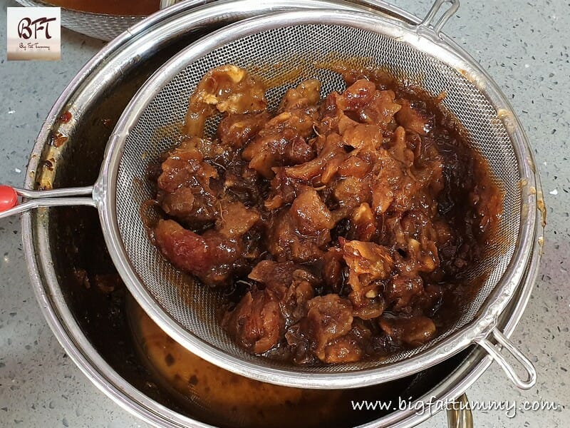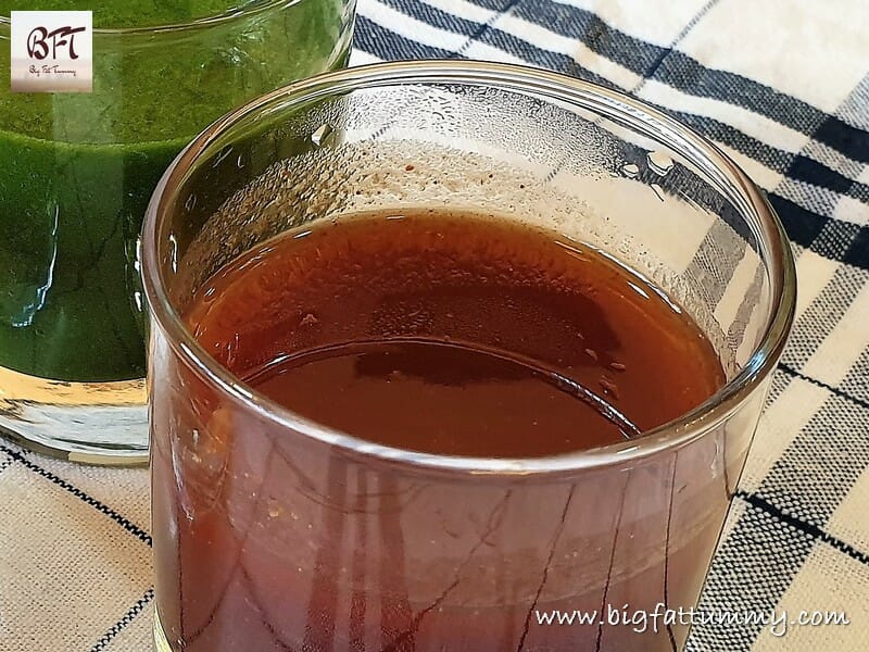 Step 1: Soak the tamarind, dates and jaggery in 500 ml boiling hot water for 2 to 3 hours till the tamarind and dates soften and the jaggery melts. Later strain and reserve the liquids.