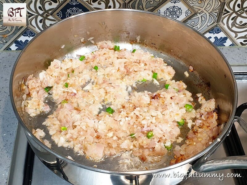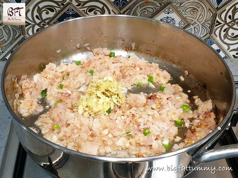 Step 3:     In another pan, heat 3 tbsp. oil and sauté the onion till light golden on medium heat. Add the green chillies and sauté for a minute. Next add the ginger-garlic paste and sauté for another minute.