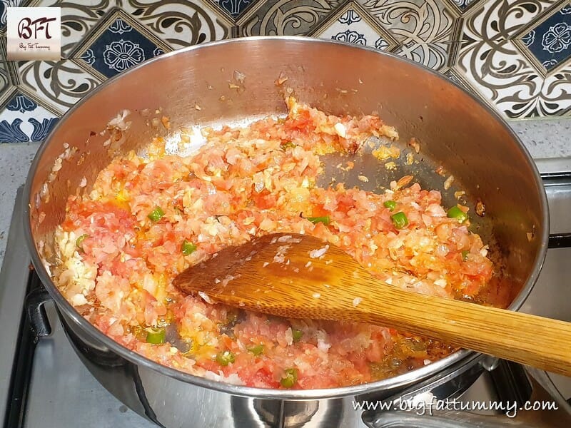 Step 4:     Add the tomatoes, ½ tsp. salt and sauté till the tomatoes turn soft.