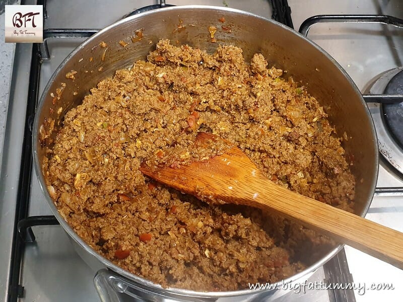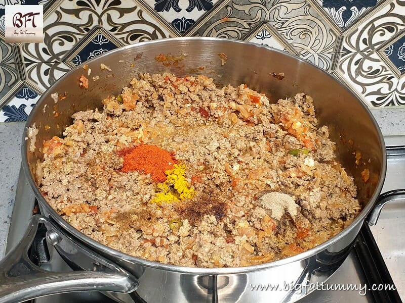 Step 5:     Next add the cooked mince and the powdered spices. Cook covered for 10 minutes.