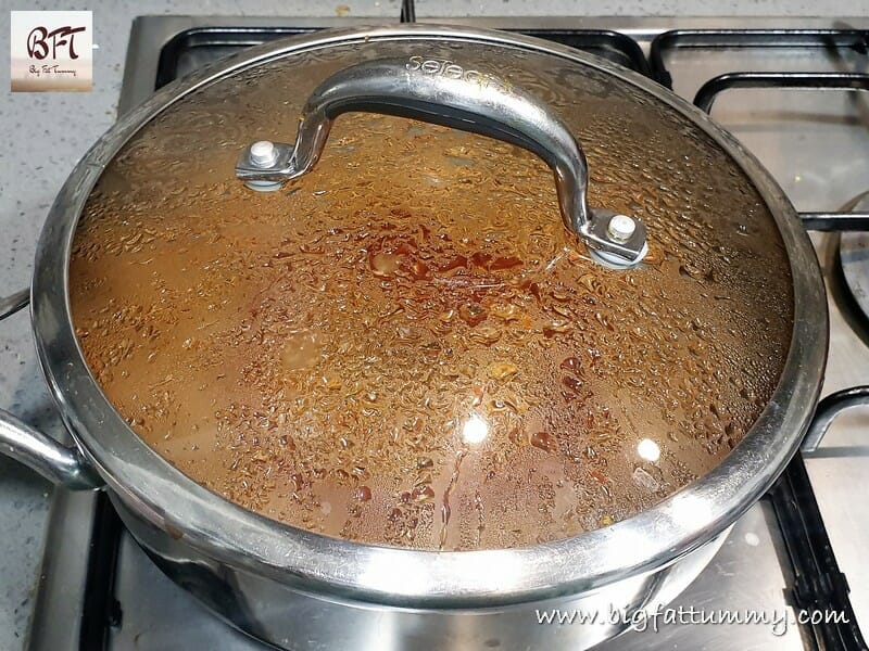 Step 2:     Later, transfer the mince to a vessel and place on heat. Once it starts changing colour and it releases liquids, add ½ cup hot water and cook covered for 15 to 20 minutes on medium heat. Keep aside.