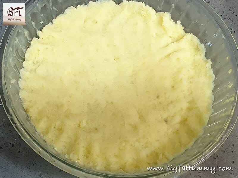 Step 6:     Divide the potato mash into two portions and use one portion to line the bottom of the baking dish.