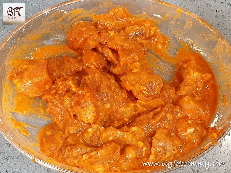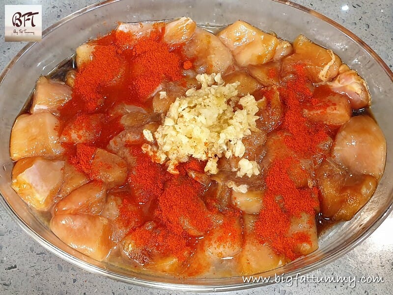 Step 2:     Marinate the chicken pieces with the salt, chilly powder, garlic paste, soya sauce and the lime or vinegar for 5 minutes.