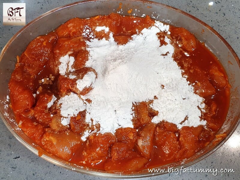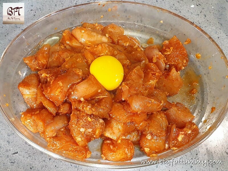 Step 3:     Next add the egg and mix. Then add 3 tbsp. of corn flour and the 2 tbsp. of rice flour (Add 1 tbsp. more of corn flour if needed). Mix well to coat the pieces and then leave aside for 10 minutes.