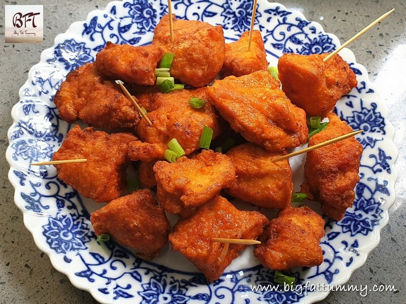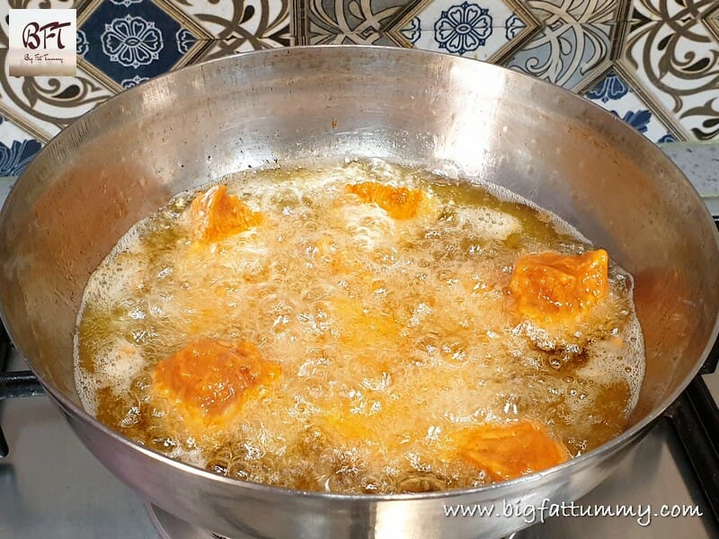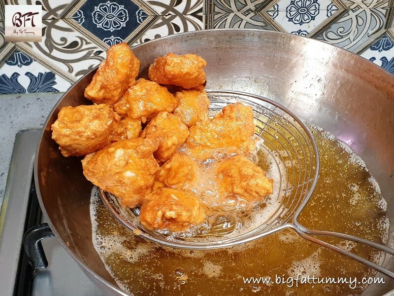 Step 4:     Heat oil in a frying pan and when hot fry the chicken pieces (a few at a time) for 2 minutes. Then remove and let the oil heat again. Fry the semi-fried chicken pieces once again for 1 more minute. Serve hot.