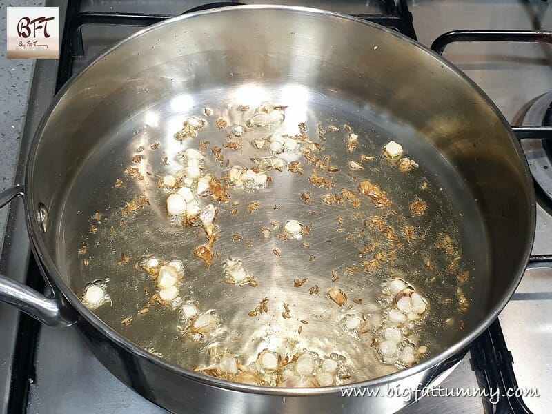 Step 2: Heat the ghee and add the cumin and garlic and sauté for a minute on medium heat. Then add the onions and sauté till soft.