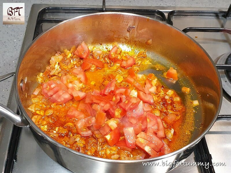 Step 3: Add the powder masalas and 1 tsp. salt. Sauté for 10 seconds and them immediately add the tomatoes and sauté for another 2 minutes.