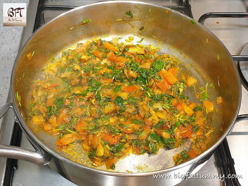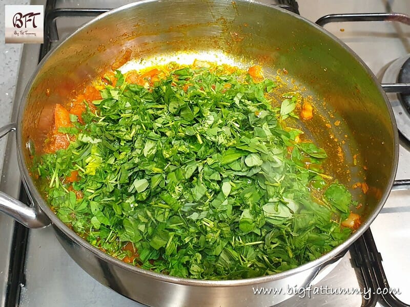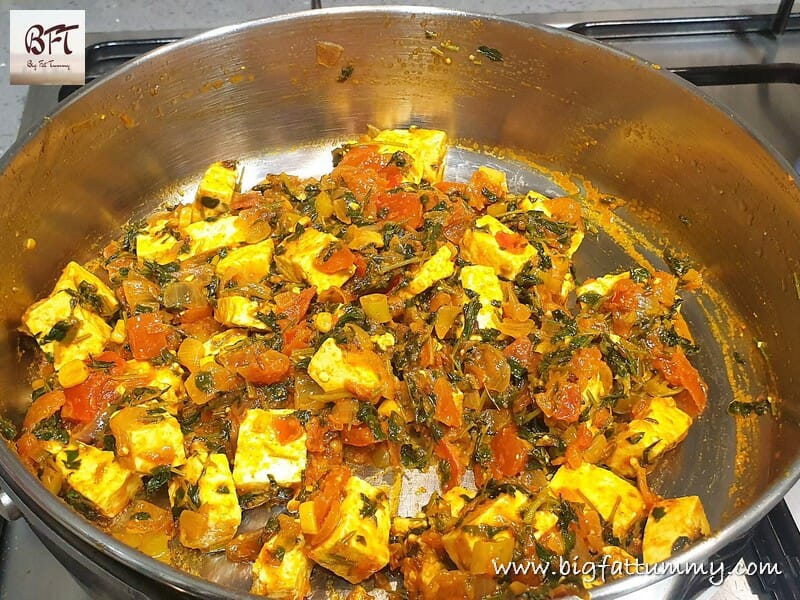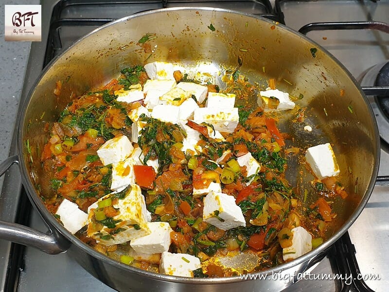 Step 4: Next add the chopped methi leaves and saute for two minutes. Then add the paneer cubes and mix. Cook covered on low heat for 3 minutes.
