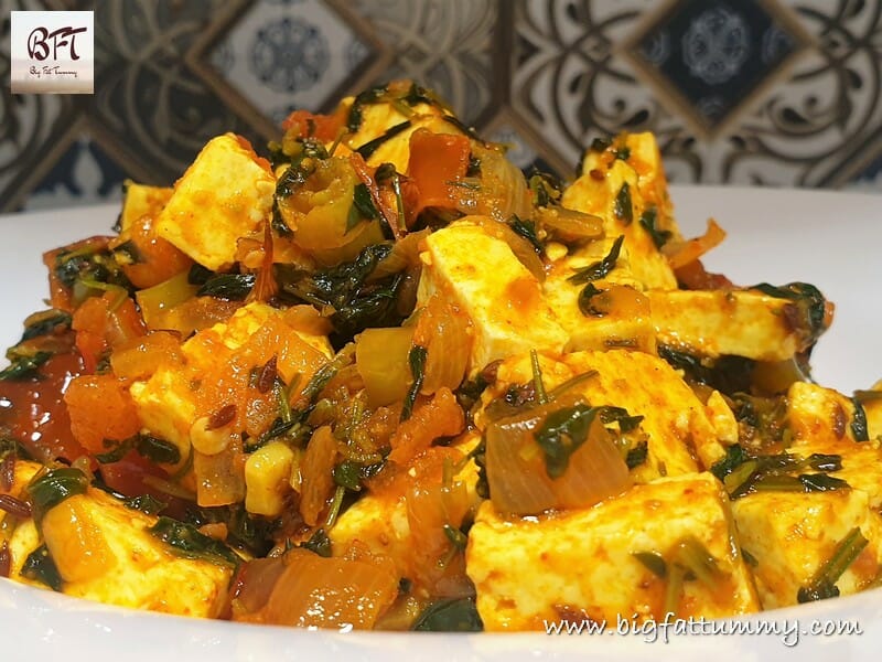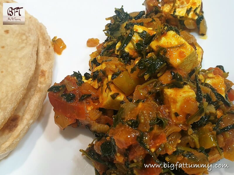 The methi (fenugreek leaves) in the recipe of Paneer Methi act as an aromatic herb which gives this dish its flavour. The bitter-sweet methi and the bland paneer complement each other very well. This preparation will pair very well with Chapatis (click here) or Tawa Parathas (click here) or even a chapati made with leftover dal (click here)