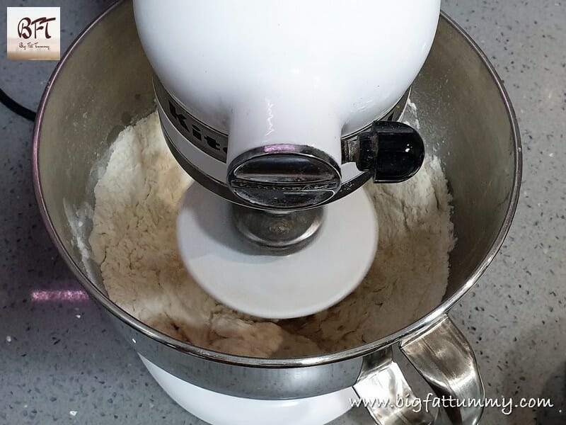 Step 3:     Then add the yeast mixture and another ½ cup of lukewarm water and knead the dough in the stand mixer at a low speed for about 5 to 6 minutes (You can also knead by hand).