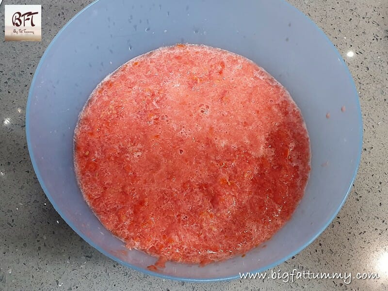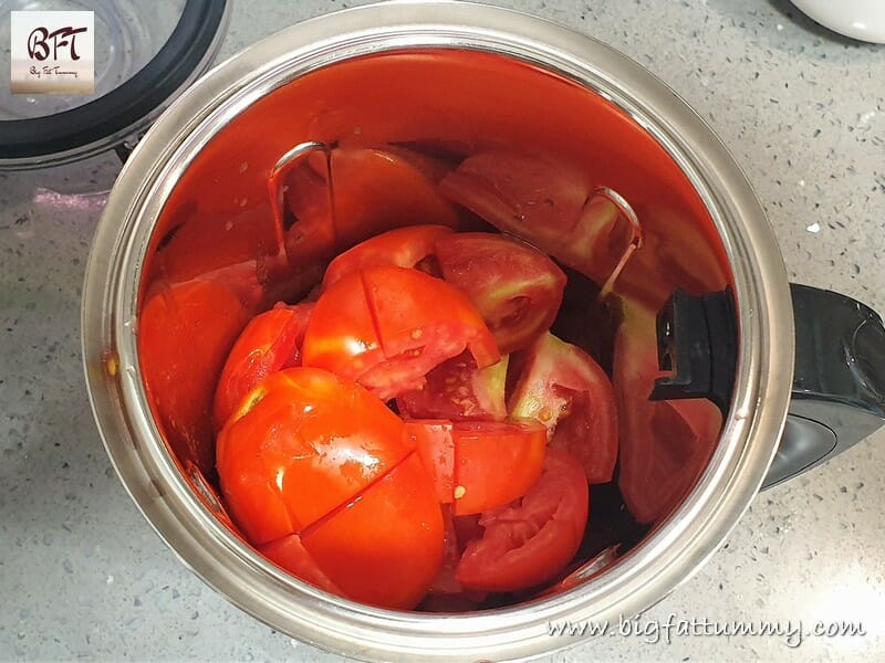 Step 1:     Wash and dry the tomatoes. Then chop them and deseed (optional). Take the chopped tomatoes in a mixer-grinder jar and grind them to a slightly coarse consistency.