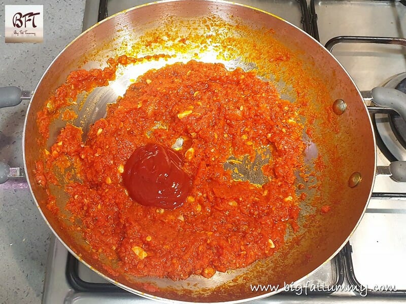 Step 6:     Add the ketchup and mix again. Let it cook further, but uncovered, so that the liquids dry up (be careful cause it’s going to splutter). Stir occasionally.