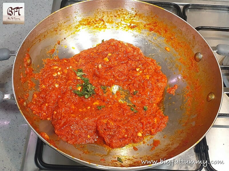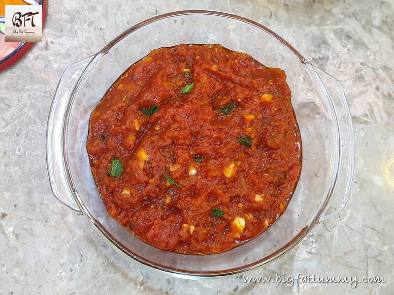 Step 7:     Once thick switch off the heat and add the chopped basil leaves and mix. Cool and use for the pizza or store in the refrigerator.
