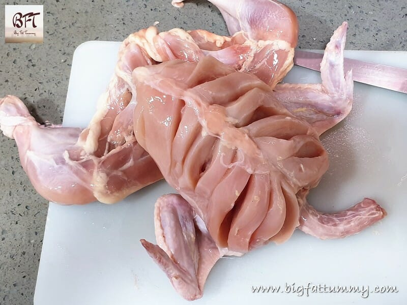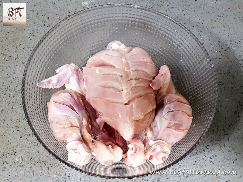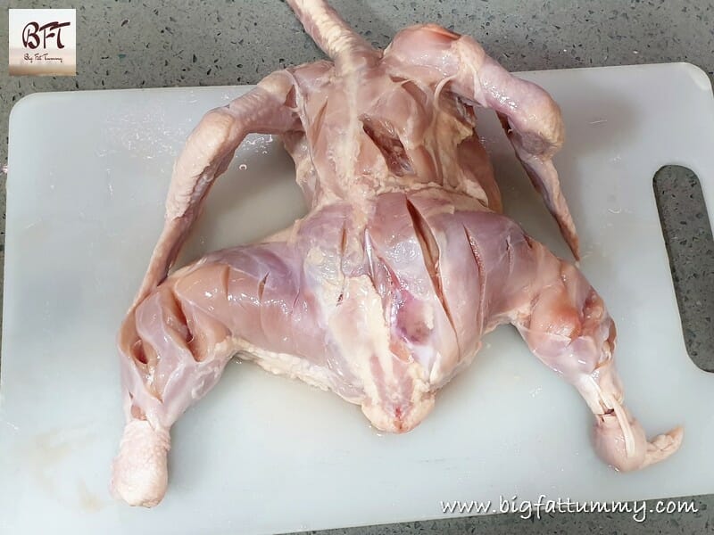 Step 3:     Wash and drain the chicken well and make deep gashes as shown in the picture. Then wipe the chicken dry with kitchen paper towels.