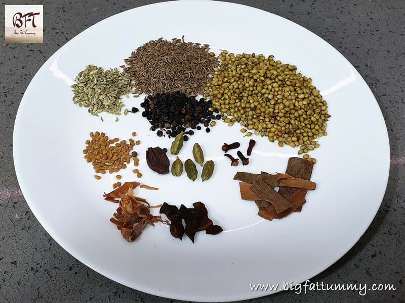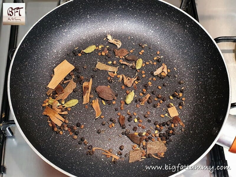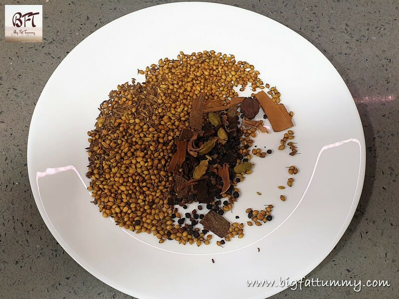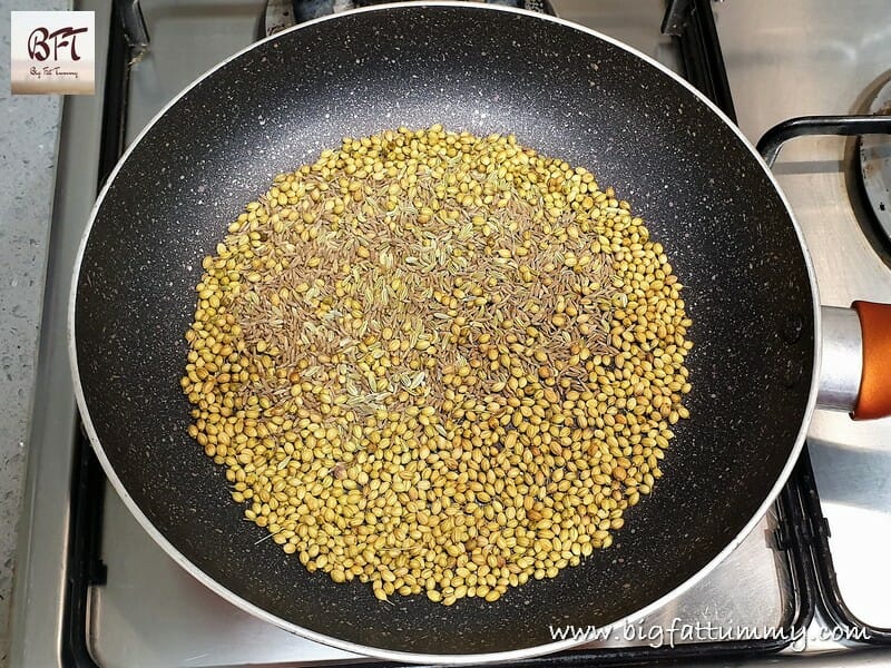Step 1:     Dry roast the coriander seeds, cumin seeds and fennel seeds on low heat till fragrant. Then transfer to a plate.