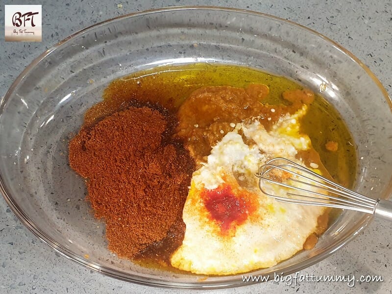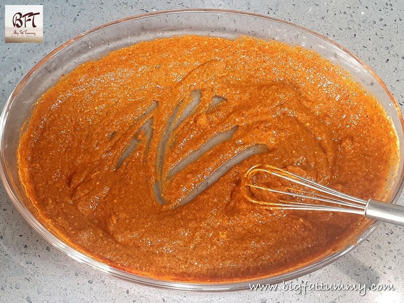 Step 4:     Take the ginger-garlic paste, curds, mustard oil, juice of the lime, salt and the powdered spices in a bowl. Add the orange food colour and use a whisk and mix well till it all comes together.
