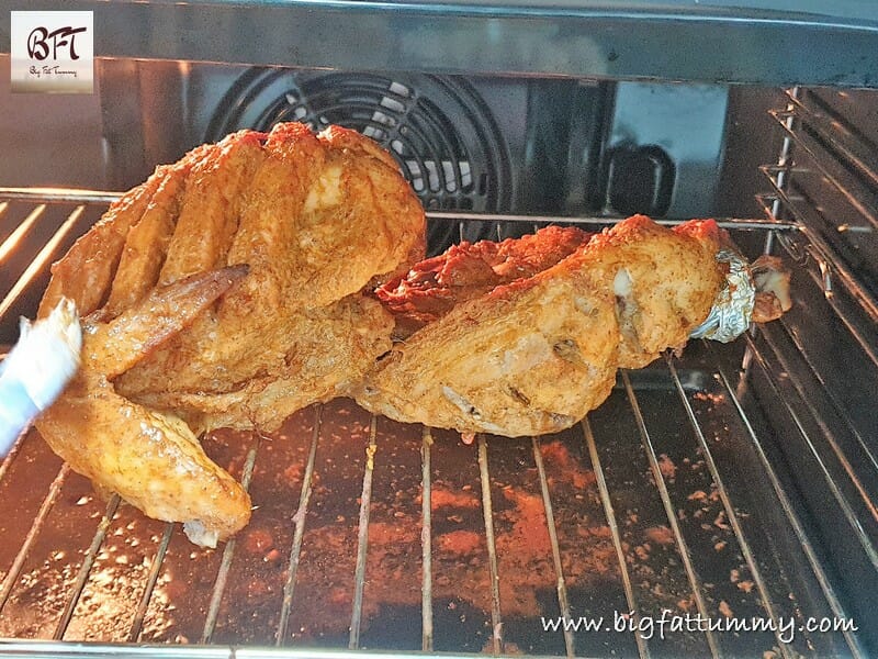 Step 11:     Once again baste the chicken on both sides and then shift the chicken to the rack nearest to the top of the oven. Grill for 10 to 15 minutes till it edges brown slightly.