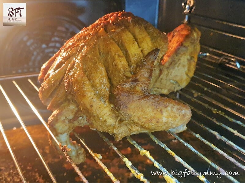 Step 8:     Remove excess marinade off the chicken, tie its legs and tuck the wings behind and place on a grill rack in center of the oven. Roast at 180° C for 30 minutes.