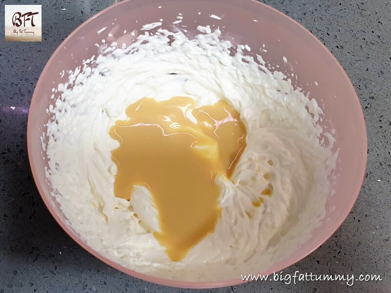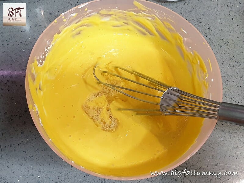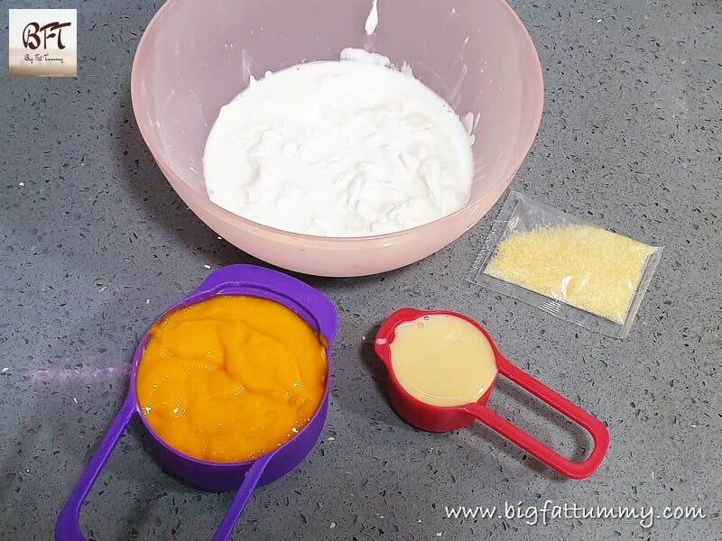 Step 6: Add the molten gelatin to the mango–cream mixture and mix it well.