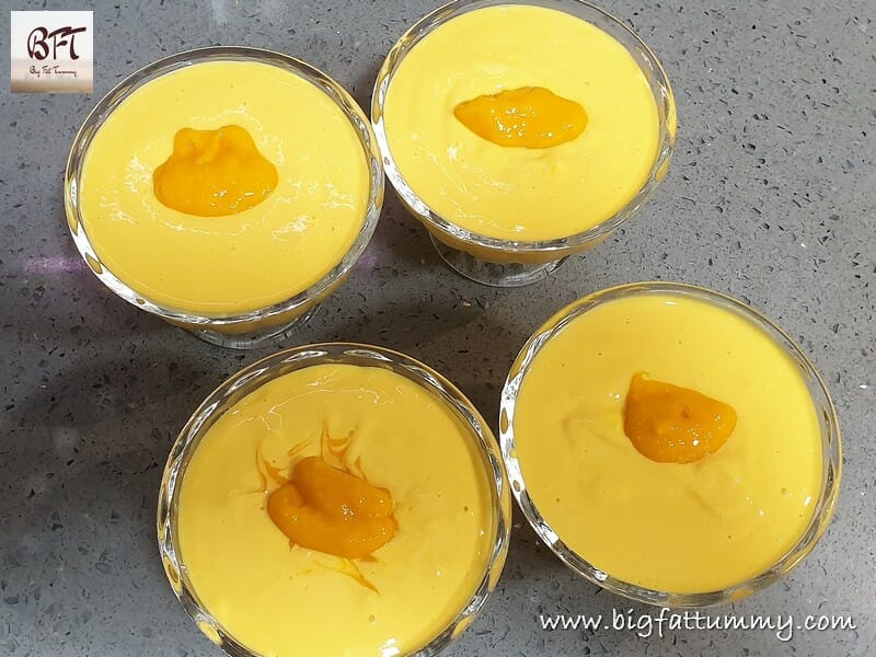 Step 9: Pour a spoonful of mango puree and twirl it to make designs, using a toothpick.