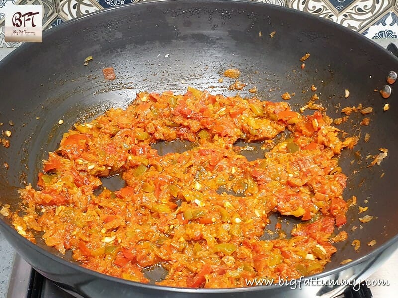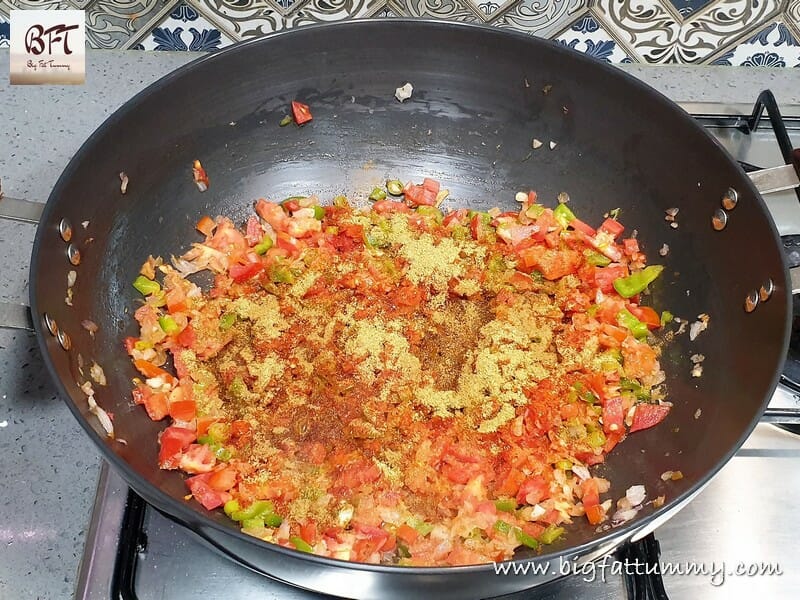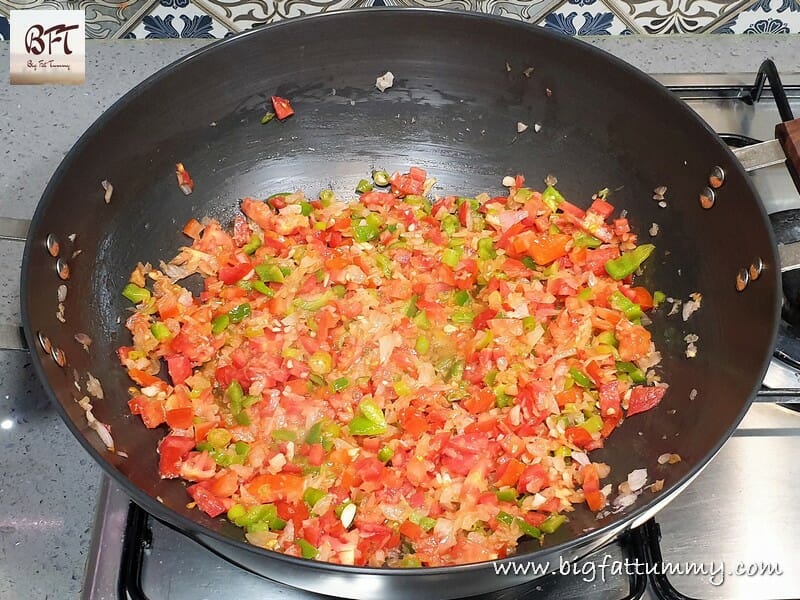 Step 3:     Now add the capsicum and green chillies and saute for a minute. Then add the tomatoes and saute on high heat for 5 minutes.