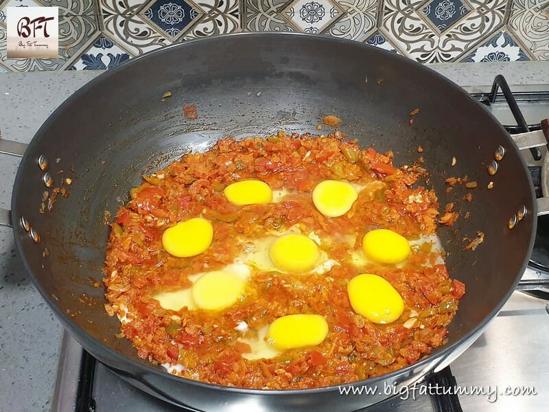 Step 5:     Make small hollows (eight) in the tomato-onion-capsicum bed, break open the eggs and place gently in the hollows. Sprinkle salt and ½ tsp. pepper powder and cook covered for 8 to 10 minutes. Garnish with green coriander and serve hot.