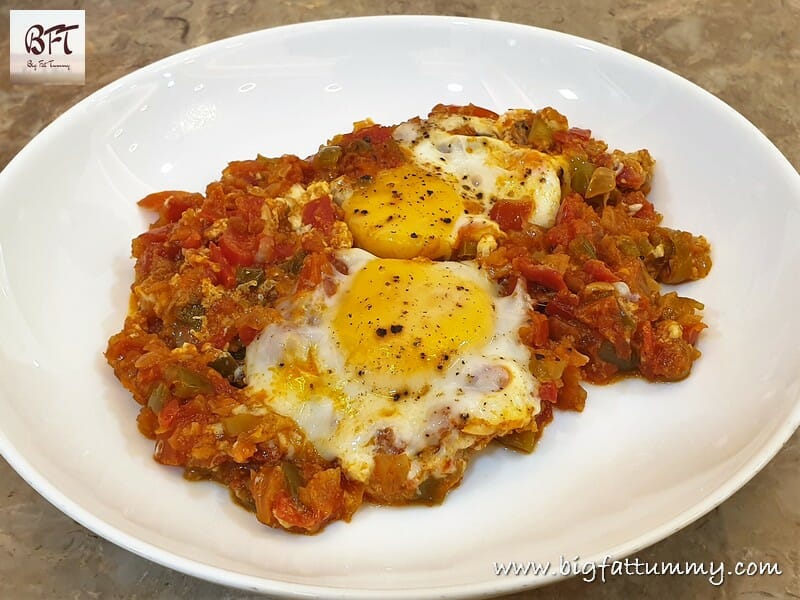 Shakshuka is a popular dish in the Middle East. It is basically poached eggs on a bed of vegetables. (There are other variations of the dish too) The ample use of tomatoes gives it its tanginess and the onions give it its sweetness. My recipe uses a few spice powders which are commonly found in Indian kitchens.