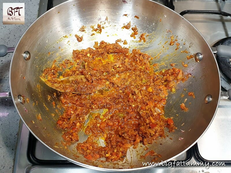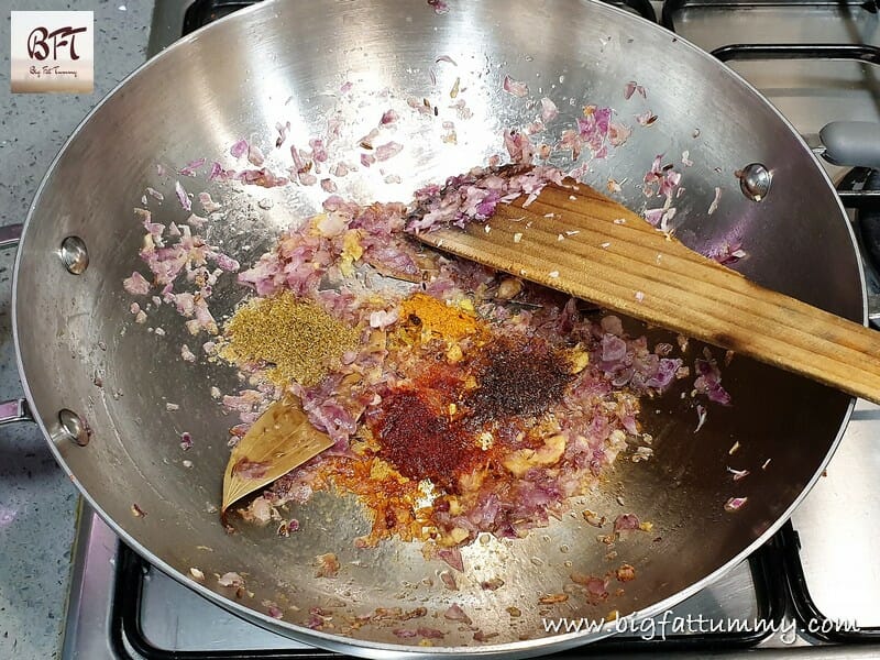 Step 5:     Add the ginger-garlic paste and sauté for a few seconds. Add the corriander powder, chilly powder and garam masala, ½ tsp. salt and sauté for a minute on low heat.