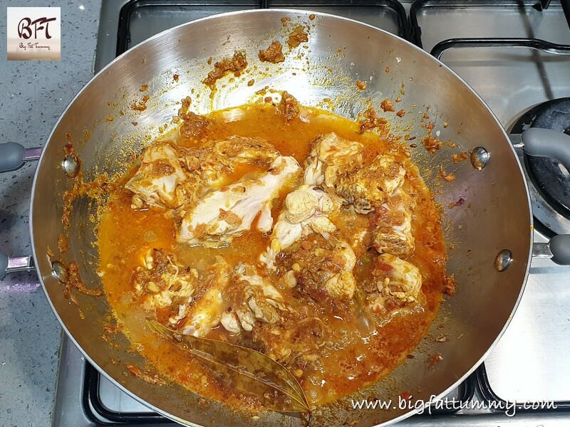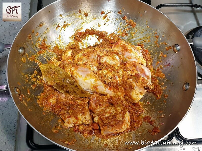 Step 8:     Add 1 cup hot water and ½ tsp. salt and cover and cook for 15 minutes to 20 minutes on low heat till the chicken is almost cooked.