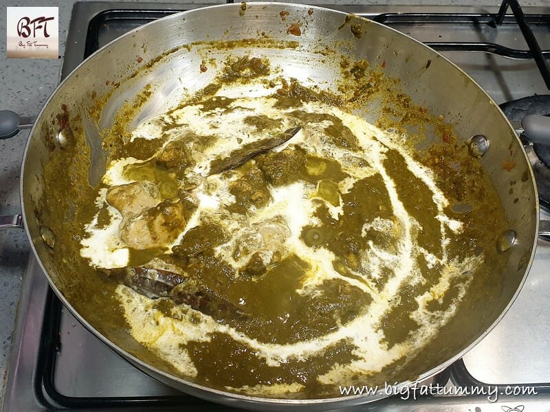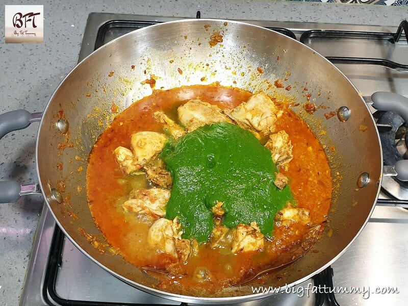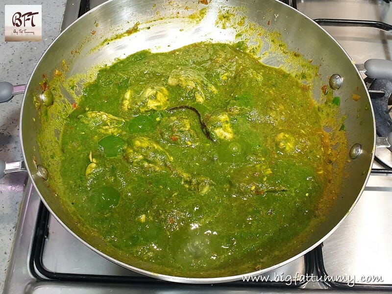 Step 9:     Add the palak puree and mix. Check for salt and add if required. Cover and cook for another 8 to 10 minutes on low heat.